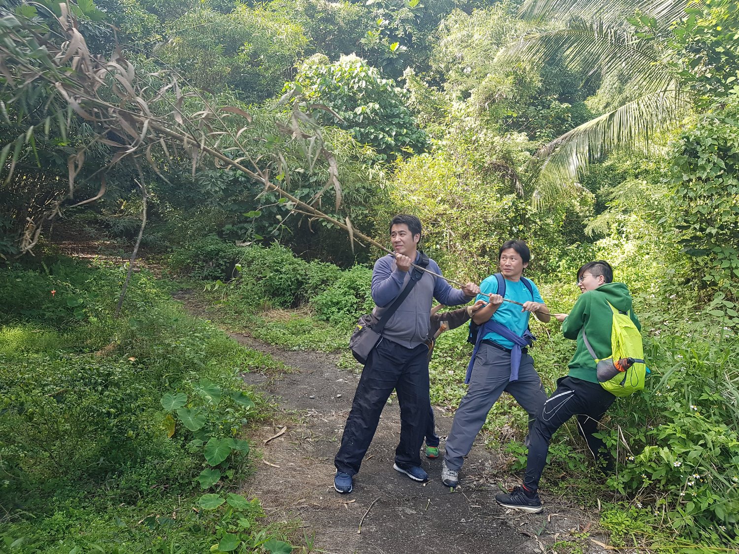 山下部落青年及媽媽帶到壽豐中山公園旁的山區,帶領大家上山辨識及採集野菜,包括山棕心、山蘇、藤心等,台北來的訪客第一次接觸這些植物,感到相當新奇有趣,而且還採到了造型奇特的黃藤果實,部落媽媽說這是小時候的零食,嘗起來很酸,相當生津止渴,大家馬上試吃看看,果然酸溜溜。