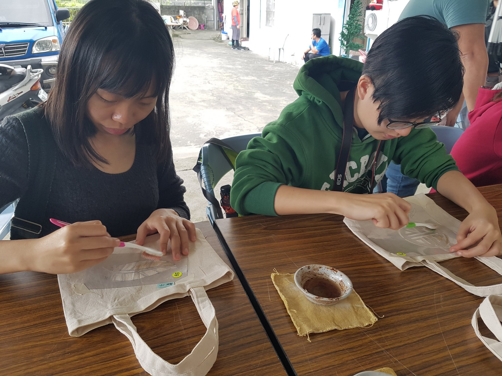 柿染 DIY 也是本次活動的重頭戲,部落青年何欣蓉 說部落的小柿子是台灣原生種的台東柿,這些柿子要浸水發酵後成為褐色染液。本次採用刷染方式,大家選擇自己喜歡的圖案膠片,放在棉布小提袋外側表面,以牙刷沾點染液刷上圖案,何欣蓉說作品帶回家後要放在有太陽的地方,顏色才會慢慢變深,染液的刷用量及接受日照的時間都會影響作品的成色,因此每個人做出來的都是獨一無二的作品。