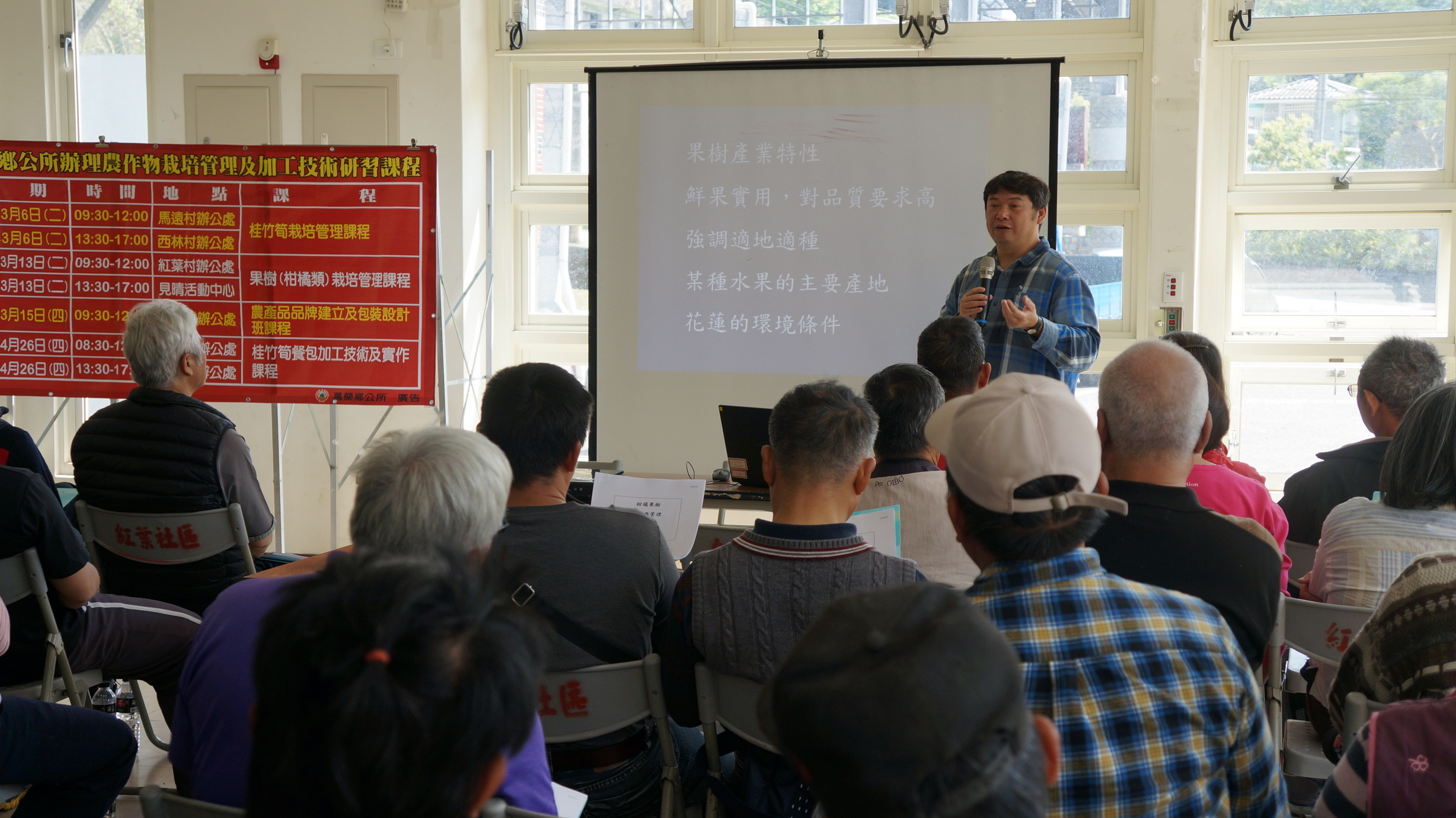 課程由萬榮鄉公所針對族人的需求,並經花蓮區農業改良場客製化的農業專業課程,本次主題以果樹(柑橘) 栽培管理為主,包含果園設置及灌排水注意事項、柑橘種類及特色介紹、柑橘整枝修剪技術、柑橘肥培管理、柑橘常見的病蟲害及防治等。講師由果樹栽培技術專家劉啟祥助理研究員擔任,以淺顯易懂、深入淺出的教學方式詳細介紹,他表示果樹是一年產一次果實的作物,生長期間也要多加注意及管理,等到產季時才能享受到豐收成果。