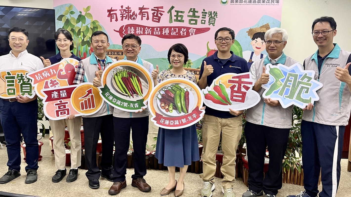 農業部花蓮區農業改良場於114年7月17日上午,在農業部一樓舉辦「辣椒新品種發表記者會」,正式發表兩個針對夏季剝皮辣椒辣度過高問題所育成的中辣與微辣新品種—‘花蓮亞蔬1號-友辛'與‘花蓮亞蔬2號-友香'。本次記者會除了介紹辣椒新品種育成歷程與優勢,更特別邀請花蓮知名餐廳「銘師父」現場示範五道創意辣椒料理,展現新品種在餐桌上的多元魅力。